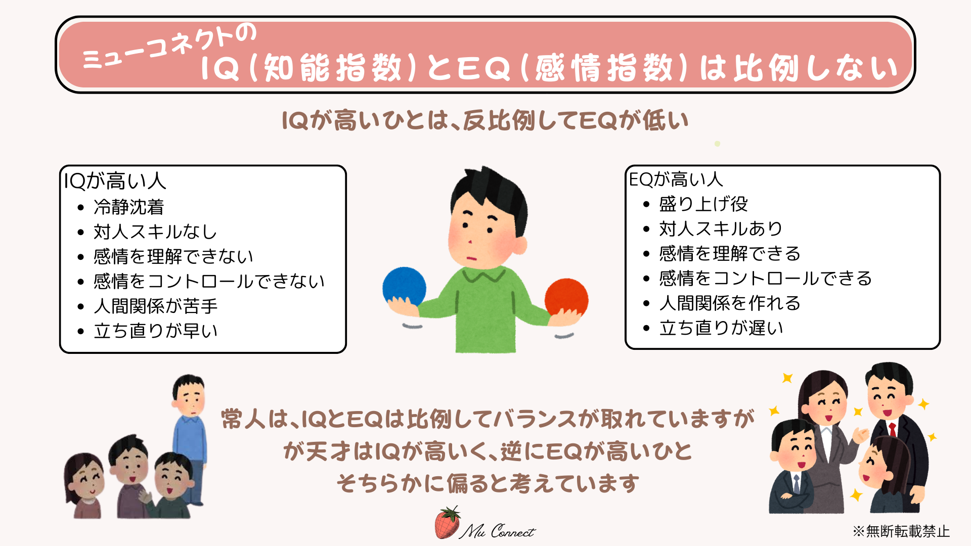 特徴EQ(感情指数)が高い人IQ(知能指数)が高い人
