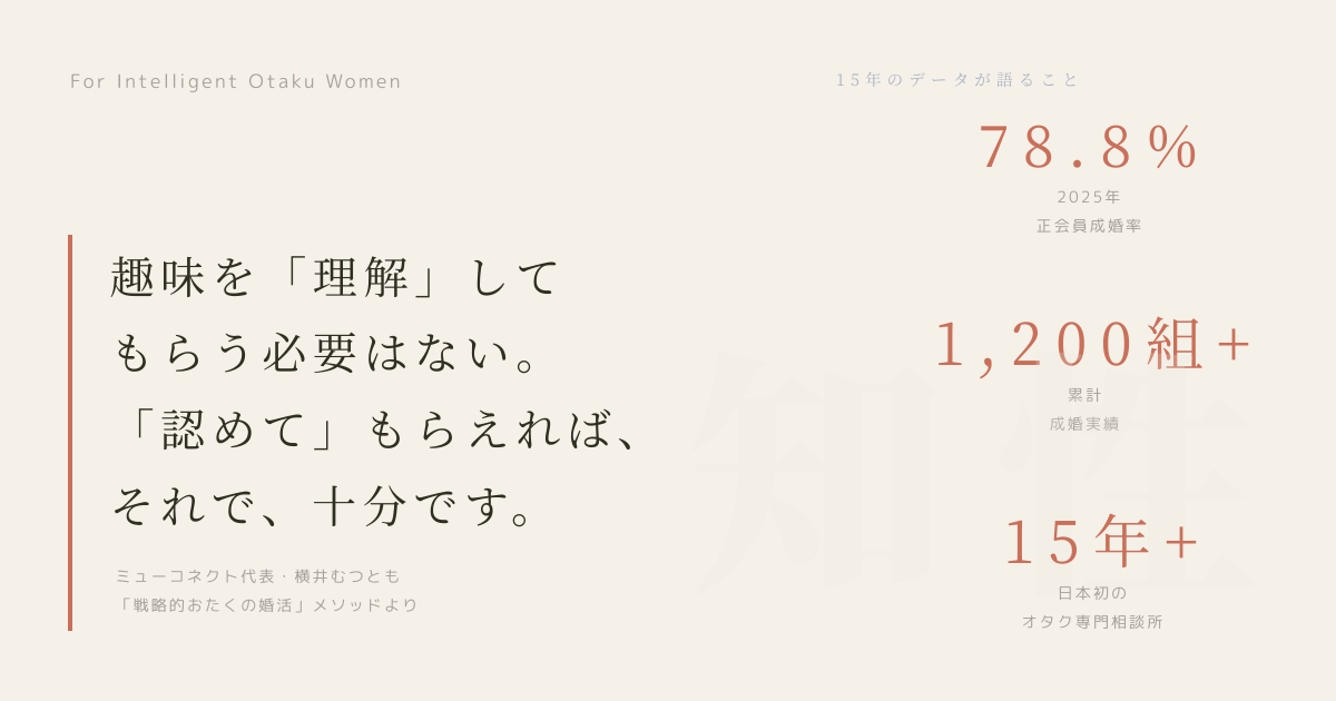 ミューコネクトは、15年・1200組以上の成婚データをもとに、 「深い趣味を持つ女性」が本当に幸せになれるマッチングを設計しています。