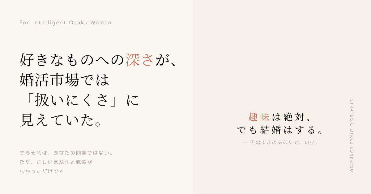 趣味を捨てたり隠したりすることは求めません。正しく言語化し、あなたの魅力として届ける戦略を一緒に作ります。